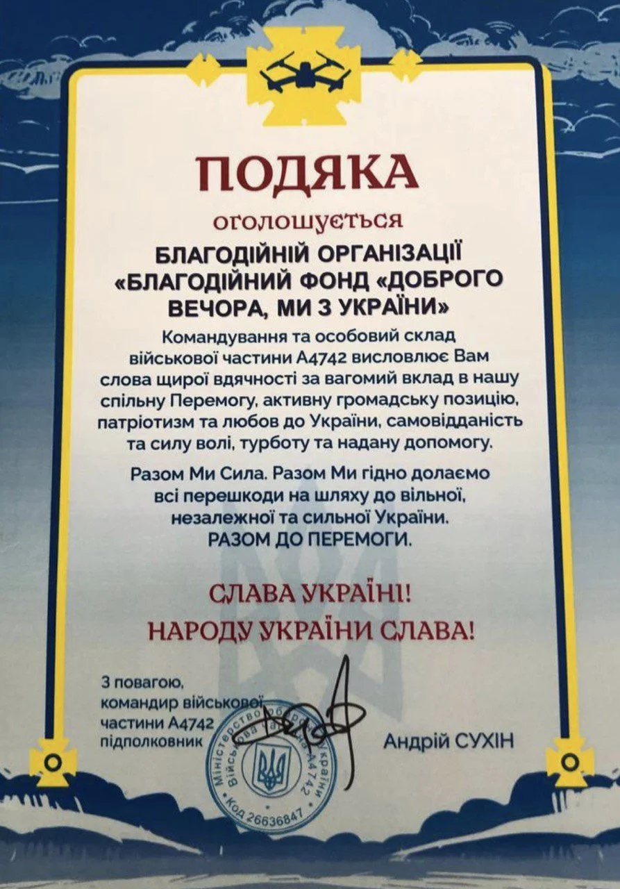 БФ “Доброго вечора, ми з України” отримав подяку від командування та особового складу військової частини А4742. Висловили слова щирої вдячності за вагомий вклад в спільну Перемогу, активну громадську позицію, патріотизм та любов до України, самовідданість та силу волі, турботу та надану допомогу.
